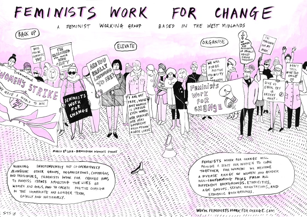 Image credit: Feminists Work For Change at the Birmingham Women’s Strike, 8th March 2018, by Sarah Taylor Silverwood